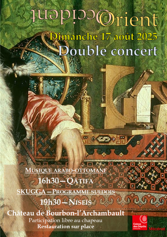 Orient Occident Un projet de l’association duChâteau de Bourbon-l’Archambault, propriété de la Fondation Saint-Louis Avec le soutien de la Caisse des Dépôts, Mécène principal https://www.youtube.com/watch?v=KNyEE0RkHqohttps://www.youtube.com/watch?v=tFVApGnzxuchttps://www.youtube.com/watch?v=L-5DEpiPL0Mhttps://www.youtube.com/watch?v=OgTfphNhomM En cas de mauvais temps, les concerts se tiendronten l’église Saint-Georges de Bourbon-l’Archambault. Les liens interculturels entre les sociétés orientales et occidentales au Moyen Âge sont essentiellement perçus de nos…